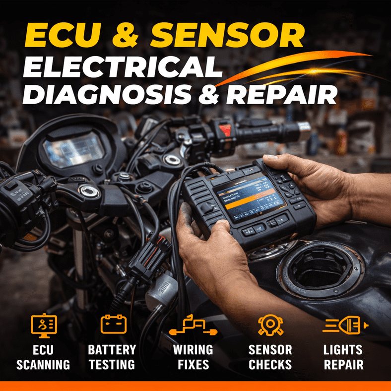 Advanced ECU scanning, wiring corrections, battery health testing, sensor calibration, headlight & indicator repair, and electrical upgrades. Ideal for resolving hidden issues affecting performance.